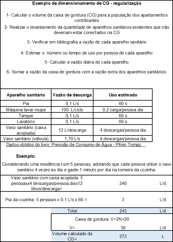 O redimensionamento da caixa de gordura, se for o caso, para os demais equipamentos sanitários que estão conectados a ela de maneira irregular, deve ser realizado em relação à vazão, número de acionamentos e número de pessoas que irão utilizá-los.